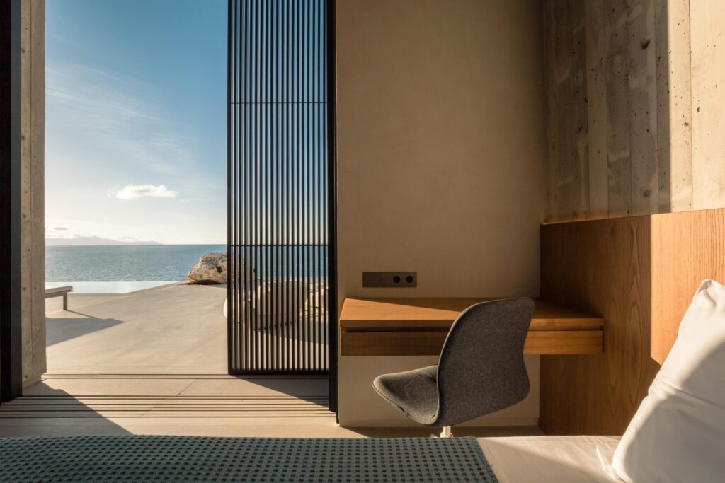 Το statement του σπιτιού είναι η ιδιωτική infinity πισίνα 25 μέτρων (90 τ.μ., με ρηχή πρόσβαση), που μπορεί να θερμανθεί. Είναι τόσο μεγάλη που πραγματικά κολυμπάς, δεν «μπαίνεις για λίγο». Στο ίδιο επίπεδο, χαμηλές ξαπλώστρες, καθαρές γραμμές, μόνο θάλασσα μπροστά. Είναι απόλυτα instagramable – ειδικά το πρωί, με το φως να περνά από τις περσίδες και να «ζωγραφίζει» το δάπεδο.