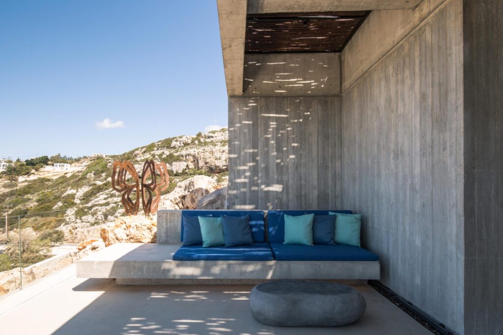 Κι όταν μπεις μέσα, αυτό το αίσθημα συνεχίζεται. Το μεγάλο ενιαίο καθιστικό/κουζίνα ανοίγει ολόκληρο προς τη θάλασσα – συρόμενα ύψους τοίχου, τσιμεντοκονία, ξύλο, μεγάλοι καναπέδες, τραπέζι φαγητού για όλη την παρέα. Είναι ο ορισμός του inside–out living: δεν ξέρεις πού τελειώνει το σπίτι και πού αρχίζει η βεράντα. Η θάλασσα μπαίνει μέσα στο σαλόνι σαν δεύτερη ταπετσαρία. Στο βάθος, ένας μεγάλος πολύχρωμος τοίχος-έργο, και γύρω του τα έπιπλα που έχει διαλέξει ο ιδιοκτήτης. Στους άλλους χώρους, μικρά patios με γλυπτά –το κοπάδι με τα ψάρια στον τσιμεντένιο τοίχο είναι από τα πιο ωραία σημεία του σπιτιού– και χρωματιστά καθίσματα που «σπάνε» τη λιτότητα.