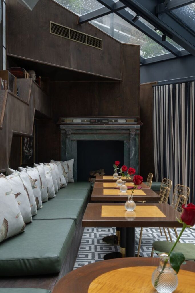 On the floor, mosaic meets industrial touches in a palette of greens and warm neutrals. In the back: a fireplace, bookshelves, a chess table, and black-and-white cats framed by witty quotes—small signatures of the space, little inside jokes you discover over time. A glass ceiling and a window-wall let Athens’ light, shadows, and sounds spill in, so it truly feels like a “home in the city” with an international vibe.