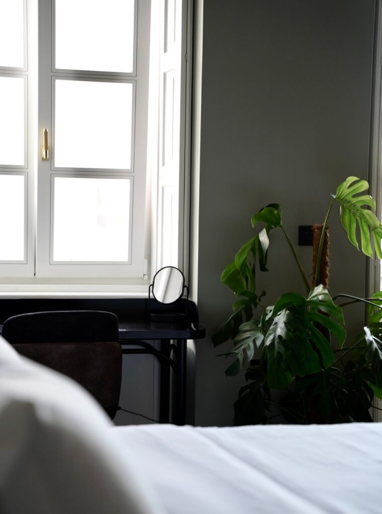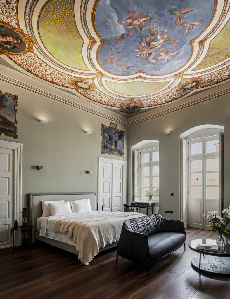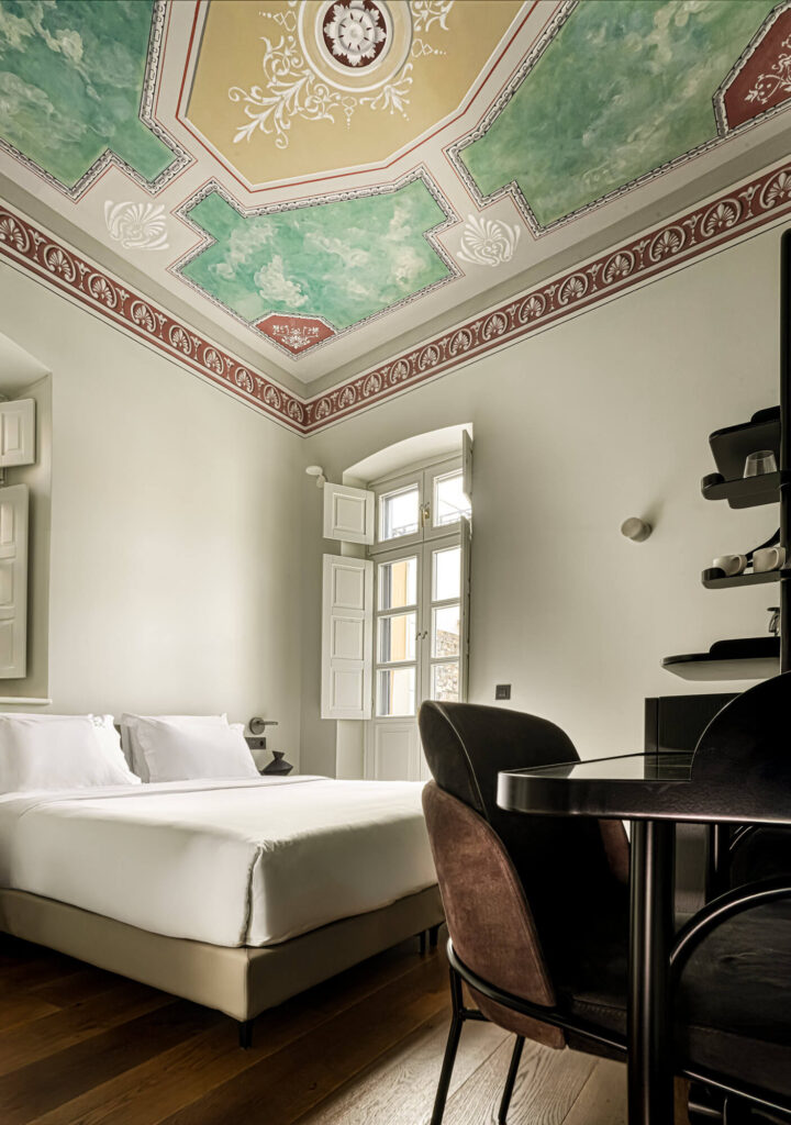 No two rooms are the same. Some feel almost Parisian, with tall doors and cornices; others are more romantic, with wall paintings; others are cleaner and more contemporary for guests who prefer less ornament. All of them, though, keep the height and air of 1853 and blend the old with designer furniture and discreet lighting. In most of them you can also see the original ceiling paintings that were cleaned or revealed.