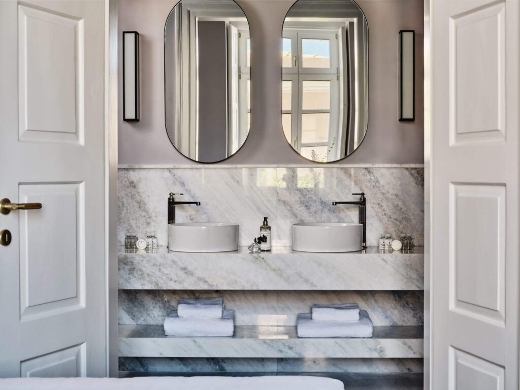 The restoration took four years and followed one principle: save the house first, add the comforts later. The Polykreti family kept the wooden and marble staircases, the 19th-century ceiling and wall paintings (several done by Venetian artists of the era), the high-ceilinged salons and the original layout – and on top of that they built a fully contemporary five-star property: 11 rooms and suites, each with its own personality, marble bathrooms, a soft, understated palette, and views across Ermoupoli’s historic quarter.
