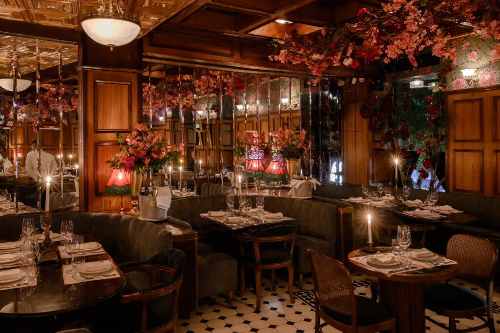 You step past the heavy velvet curtain at the entrance and leave Dexameni Square behind. In front of you, a bright marble-topped bar; behind it, an impressive, softly lit wine fridge. Shelves packed with bottles set the tone immediately. Mirrors, rose-patterned wallpaper in full bloom, green velvet armchairs, candles and low lighting create a scene that feels lifted from an old Parisian film—you half expect the next scene to be shot around you.
