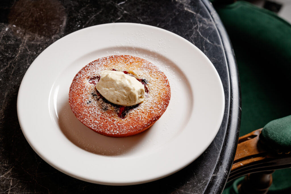 To finish, the almond clafoutis with red fruits and a cherry-liqueur-scented cream arrives warm and fragrant, with juicy fruit and a tender, aromatic batter.