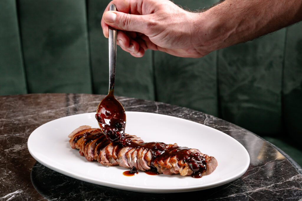 For mains, the duck breast with red fruit compote and cedar-scented duck sauce keeps a rosy core and strikes a pleasing balance between sweetness and the meat’s savoury intensity.