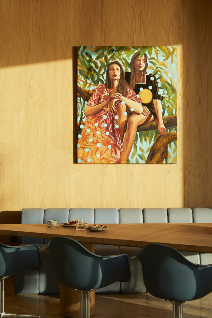 Art plays its own role here: a textile piece by The Callas (Lakis and Aris Ionas) welcomes you above the sofa at the entrance; Marc Quinn’s emblematic Eye Iris opens a gaze towards the sea; while works by Stella Kapezanou and Nick Thomm bring colour and narrative to different corners – even in the bathroom.