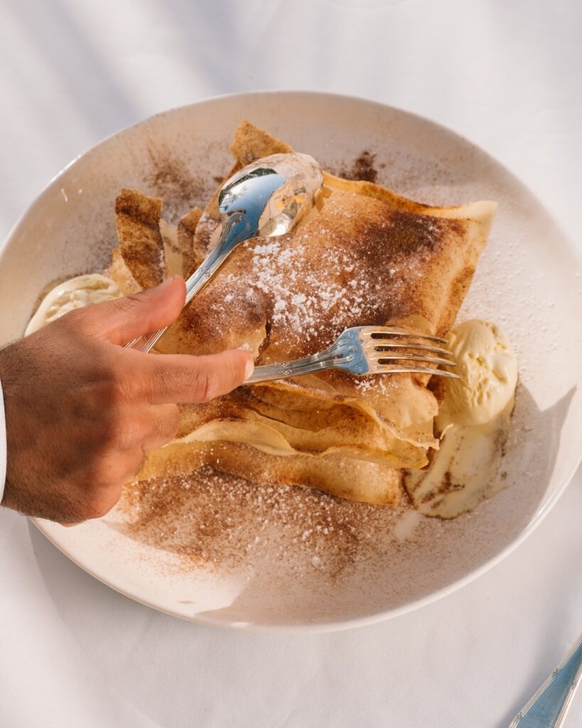 For dessert, the lemon tart is a sure thing, but the pear tart with vanilla ice cream, and the bougatsa made for sharing (2–4 people), have become iconic. Demand is such that the pear tart even travels to your doorstep via delivery.