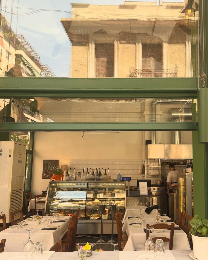 Minimal, bright, with large windows, linen tablecloths and a starring glass-front fridge packed with carefully chosen cheeses from all over Greece. Vinyl plays softly in the background. On the menu, Florina and Northern Greece show up with Balkan hints and clean, confident flavours: marinated beets with a roasted depth, mushrooms with a smoky pea-fava purée, kavourmas in a sizzling pan with a sunny-side-up egg, buffalo burger, and handmade pasta baked with slow-cooked beef in the wood oven. Don’t miss the bean soup with Prespes beans and smoked Aridaia pepper. For dessert: walnut cake with stretchy kaïmaki, or saragli with pistachio ice cream.