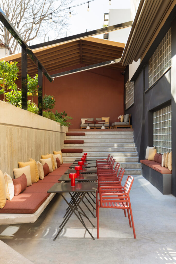 Whether you’re sitting in the sunny garden with its big communal tables and concrete steps scattered with cushions, or tucked away in the mezzanine co-working lounge with reading corners and natural light, the atmosphere is relaxed yet creatively charged.