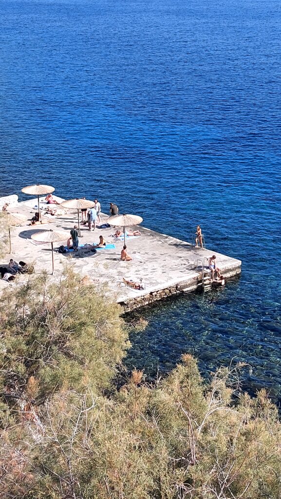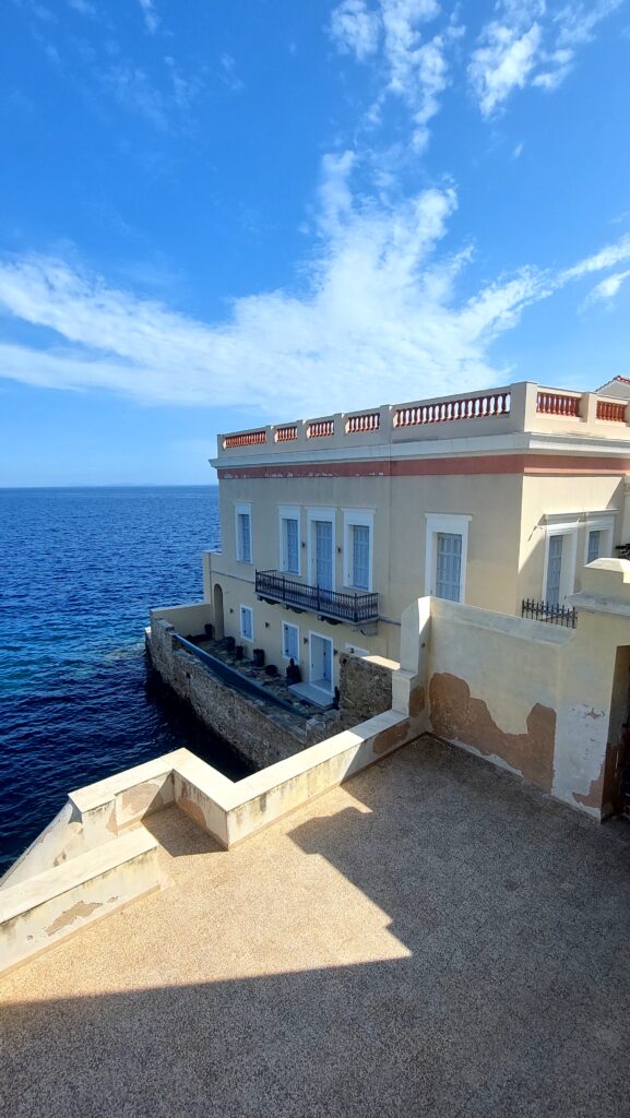 And just as you’re wandering through the narrow lanes of the cosmopolitan Vaporia quarter, you pass by Villa Selena and, almost without realising it, you emerge on the open sea side at Asteria, with the concrete platform that’s perfect for diving straight into the water. It’s only a few steps down from the street and it gives you a full view of Ermoupoli’s neoclassical facades.