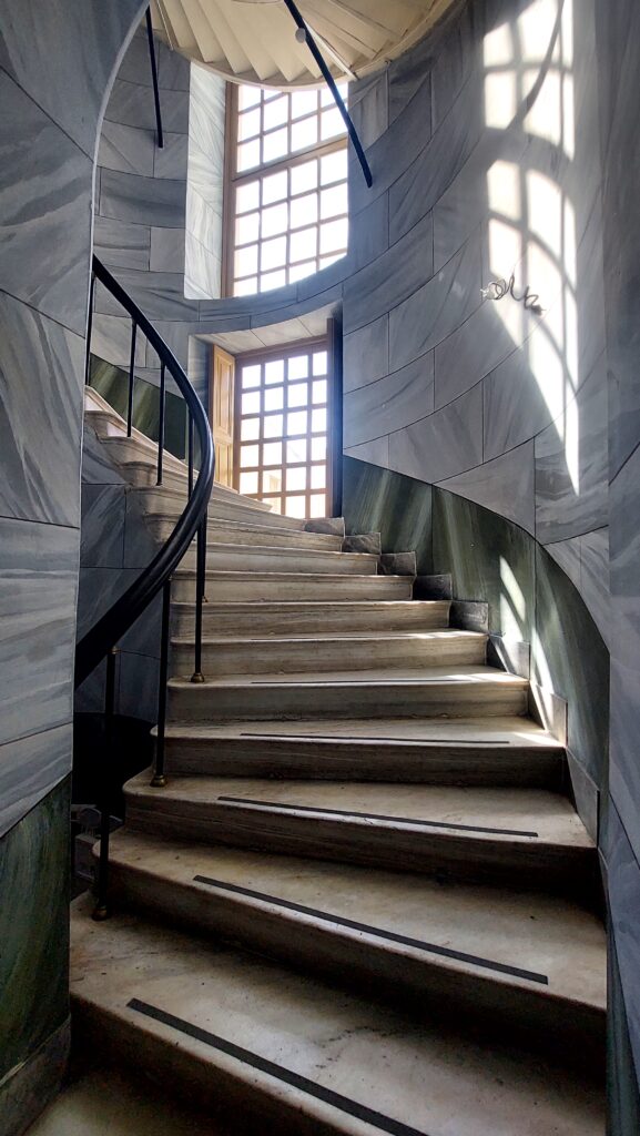 Higher up, in Vrontados, the “Kyveli” House –an 1870 bourgeois residence literally embraced by the rock, overlooking the harbour– functions as an institute and memory space for the legendary actress. Down on the north quay, the Cyclades Gallery, designed by the Bavarian architect Johann Erlacher, recalls the very first public buildings of Ermoupoli, when the town was being built with European self-confidence. And, of course, the Prasakakis Mansion –one of the first private mansions of Ermoupoli, also attributed to Erlacher– with its marble staircases and painted ceilings, today home to the Cyclades Chamber of Commerce, is one of those houses that make it obvious a real urban class once lived here.