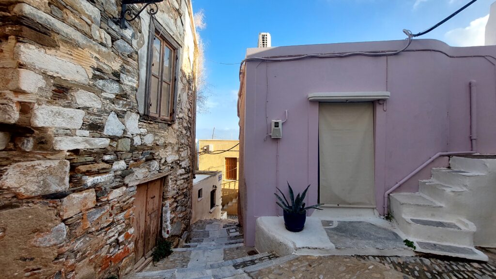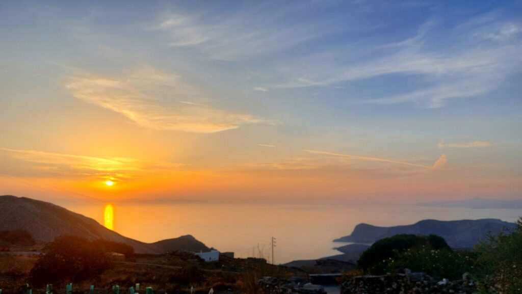 A little further north, in the village of San Michalis, sunset is simply magical: you don’t just see sea, you see terraces, drystone landscapes, donkeys in the fields – a softer, everyday, rural side of Syros you don’t expect when you stroll through Miaouli Square.