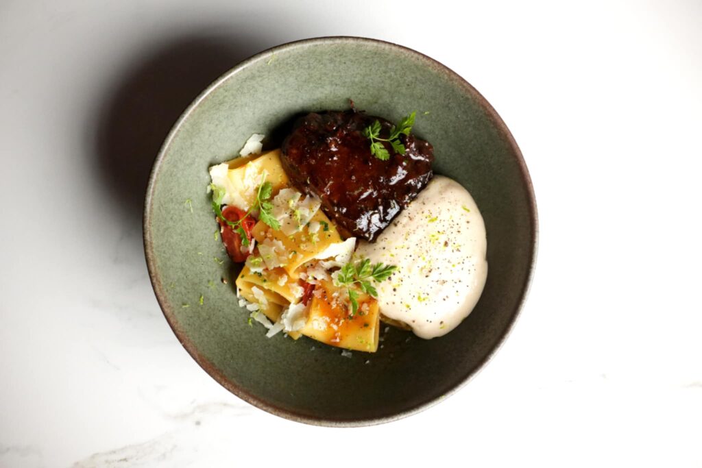 Και μετά… τα «βαριά χαρτιά». Το παστίτσιο αποδομημένο είναι ακριβώς αυτό που υπόσχεται: αντί για μακαρόνια, paccheri, αντί για κιμά, μοσχαρίσια μάγουλα μαγειρεμένα σε σάλτσα από confit ντοματίνια· νιφάδες γραβιέρας και μπεσαμέλ σε μορφή κρέμας, στρωμένη στο πλάι σαν βελούδο. Έχει τη γεύση της Κυριακής, αλλά με την ακρίβεια ενός σεφ που ξέρει τι κάνει.
